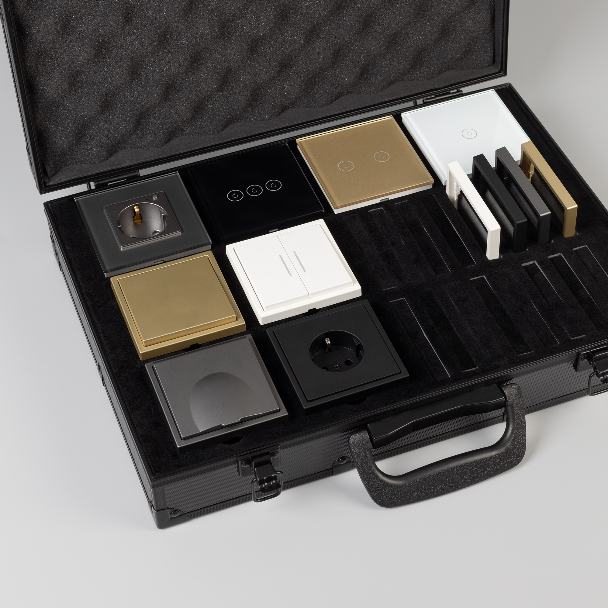 Демо-кейс с наполнением серии NOBE и OMALI. Демо-кейс содержит: Рамки серии NOBE в цветах белый, черный, золотой и серебристый (серый). Поверхность рамок имеет Soft-Touch покрытие: арт.054212 - 2шт арт.054213 - 2шт арт.054214 - 2шт арт.054211 - 2шт Механизм выключателя на одну клавишу (непроходной) в золотом цвете - арт.054253. Механизм выключателя на две клавиши с подсветкой LED (непроходной) в белом цвете - арт.054239. Механизм розетки под евровилку в черном цвете - арт.054277 Механизм розетки влагозащищенный в серебристом(сером) цвете - арт.054283 Выключатель сенсорный на одну клавишу с Zigbee управлением в белом цвете - арт.050035 Выключатель сенсорный на две клавиши с Zigbee управлением в золотом цвете - арт. 050038 Выключатель сенсорный на три клавиши с Zigbee управлением в черном цвете - арт. 050046 Розетка с Zigbee управлением в серебристом(сером) цвете - арт. 050101 Рамки представленной серии накладного типа монтажа - не требуют дополнительного оборудования для установки рамки на механизме.