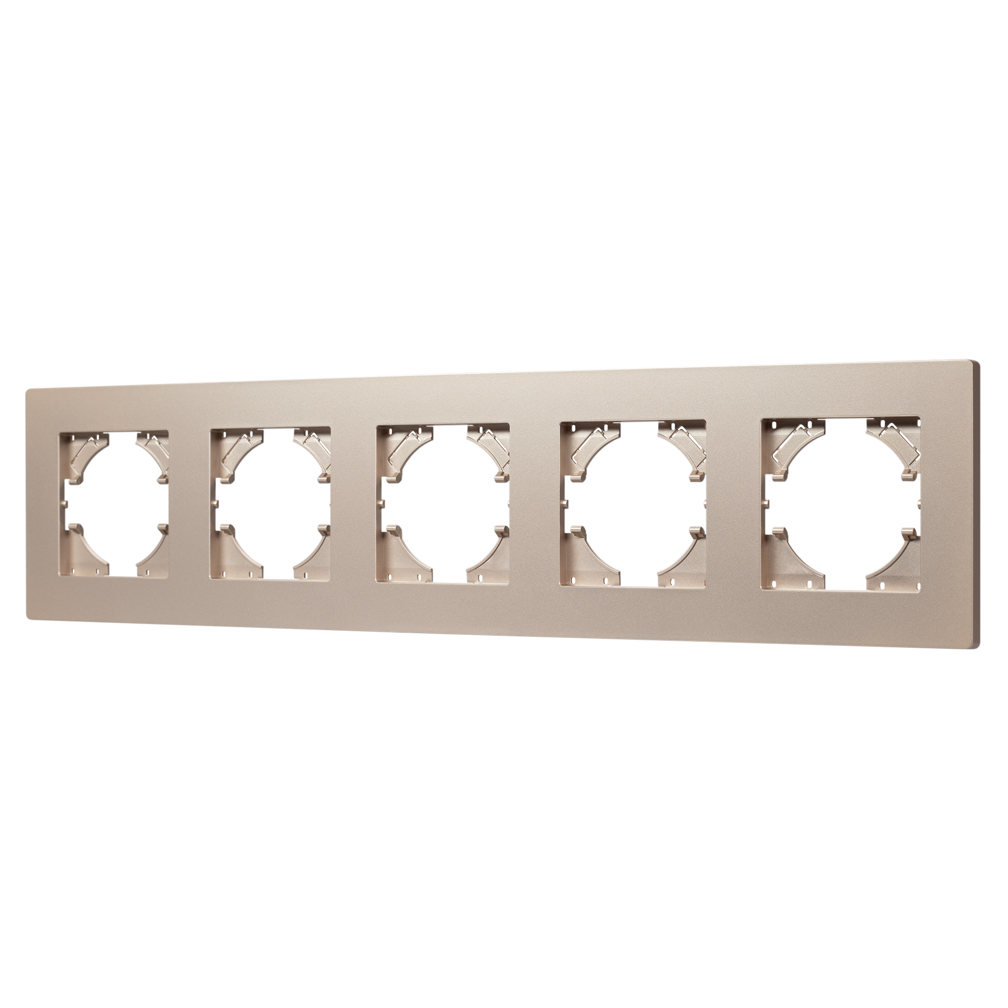 Рамка пластиковая на 5 постов, под встраиваемый механизм. Цвет - золотой. Среднего уровня герметичности IP20. Ориентация монтажа - горизонтальная (основным ориентиром служат посадочные выступы для накладки механизма).