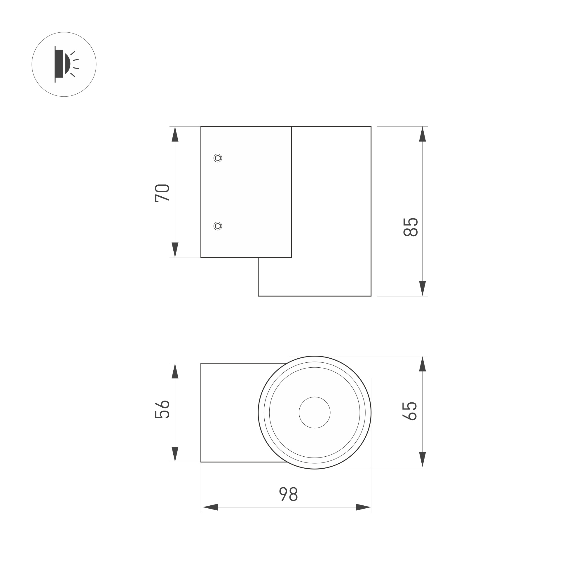 Накладной настенный светильник. Мощность 9 Вт, св. поток 860 лм, 95 лм/Вт, теплый 3000 K, CRI>80, угол 23°, напряжение питания 230 В. Темно-серый фигурный корпус из алюминия, экран стекло, степень защиты IP65. Размер: длина 98 мм, ширина 65 мм, высота 85 мм. Монтаж накладной. Драйвер встроенный, пульсация <2%.